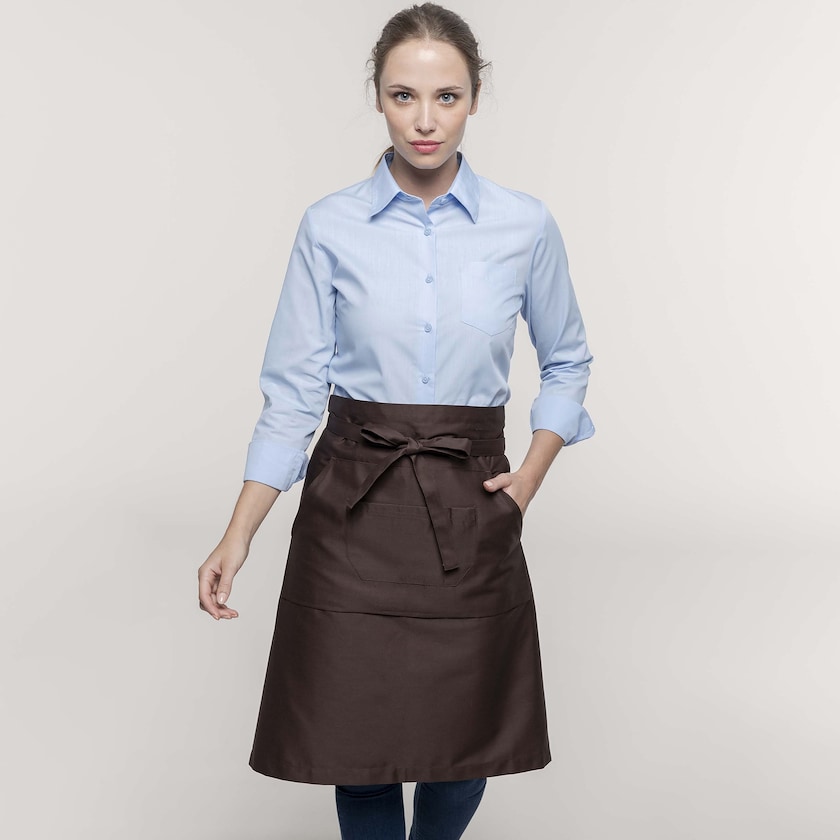 Förkläde av tålig polyesterblandning. Förklädet har en magficka samt ytterligare en ficka som är uppdelad i två förvaringsutrymmen. Längden är 62,5 cm och bredden 90 cm.