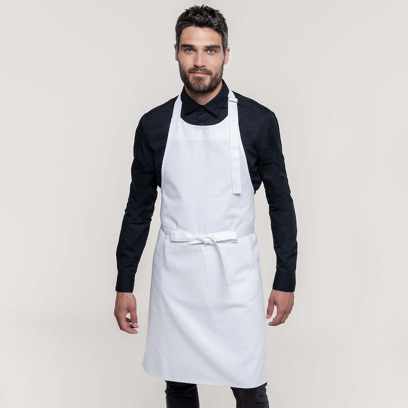 Högkvalitativt förkläde som klarar tvätt i höga temperaturer. I vanlig tvättmaskin klaras tvätt upp till 60 grader och i industritvätt upp till 85% i enlighet med ISO 15797. Framtill finns en stor ficka med två förvaringsutrymmen. Förklädet har en längd på 90 cm och en bredd på 76 cm.