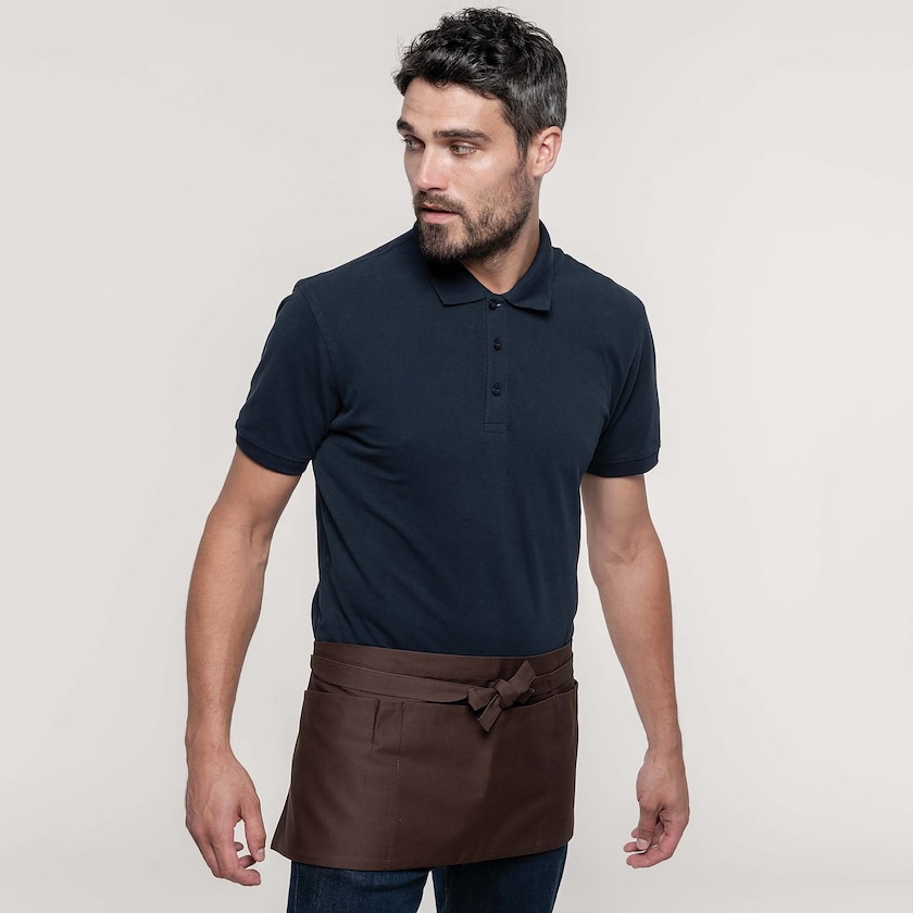 Kort förkläde som finns i flera färger. Förklädet är tillverkat av 100% bomull. Längden är 26 cm och bredden 70 cm. Förklädet har tre fickor.