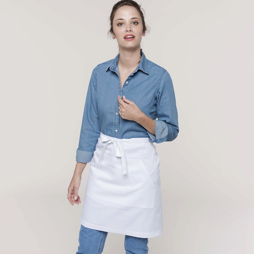 Förkläde med tyg av tålig polyesterblandning. Framtill finns en stor ficka samt en mindre ficka med två förvaringsutrymmen. Längden är 50 cm och bredden 90 cm.