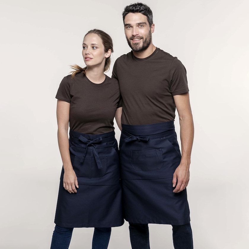 Kort förkläde av 100% bomull med två fickor. Förklädet har en längd på 90 cm och en bredd på 62,5 cm. Finns i flera trevliga färger.
