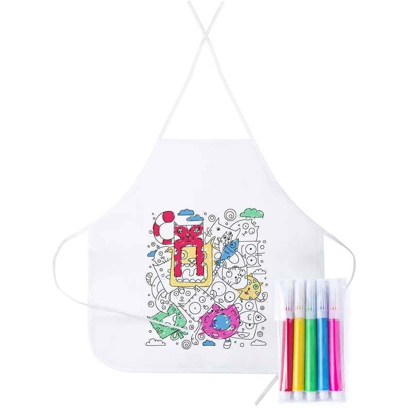 Kul förkläde för barn som går att färgläggas. 5 st färgpennor medföljer. Förklädet är tillverkat av non-woven-material.