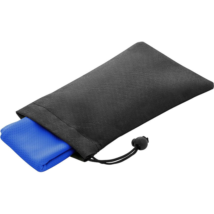 Miljövänlig sporthandduk i svart förvaringspåse. Handduken är sval även när den är blöt. Handduken är tillverkad av rPET, dvs återvunna PET-flaskor. Förvaringspåsen är av non-woven-material. Tryckytan på handduken är 100 x 60 mm och 140 x 80 mm på förvaringspåsen.