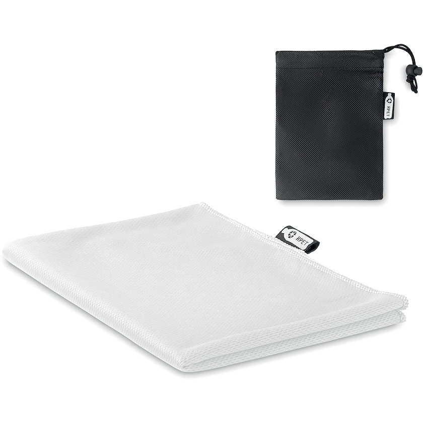 Miljövänlig sporthandduk med tryck. Handduken absorberar mer vatten än en normal handduk. Perfekt att på gymmet. Handduken liksom förvaringspåsen är tillverkad av rPET, dvs återvunna PET-flaskor.