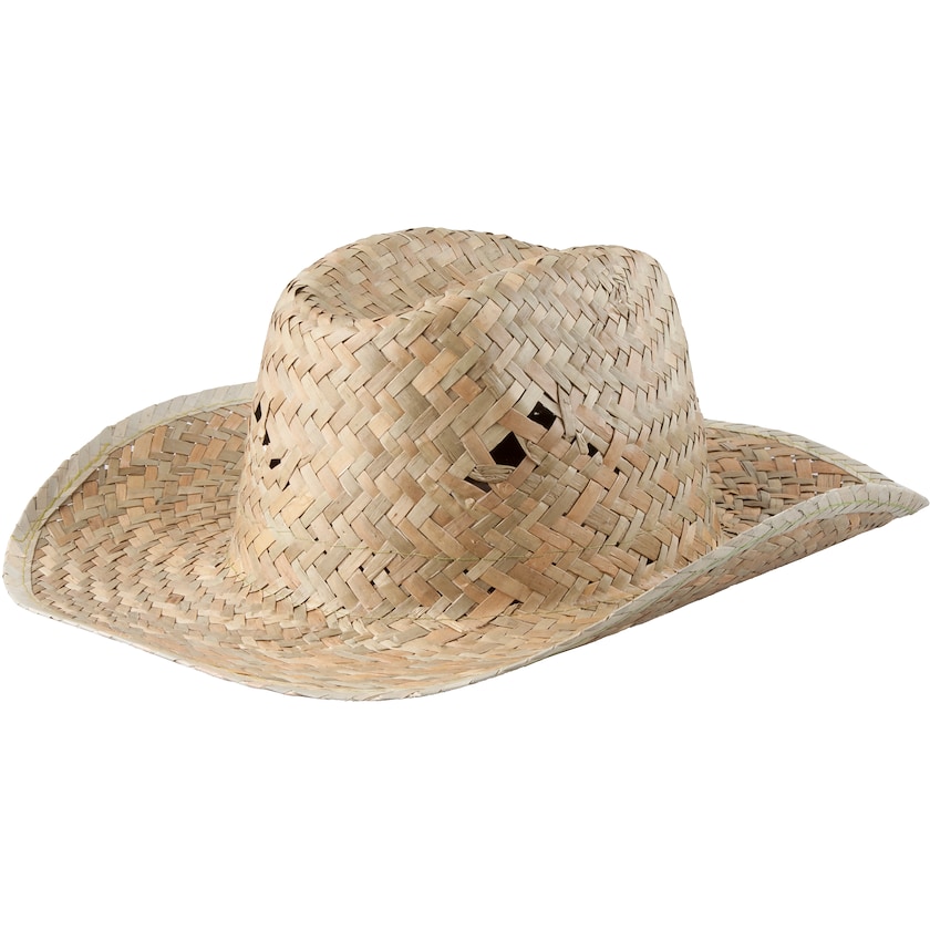Stråhatt i unisexmodell. Trycket sker på ett band av non-woven-material som finns i flera möjliga färger (se detaljbild). Bandet levereras påsydd på hatten.