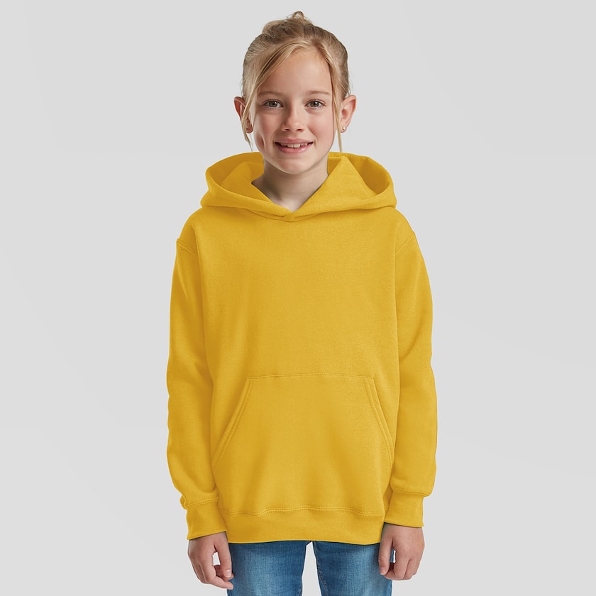 Fruit of the Looms klassiska huvtröja i barnstorlekar. Tröjorna saknar halssnörning för att minimera risken för strypolyckor. Levereras styckförpackad i plastpåse.