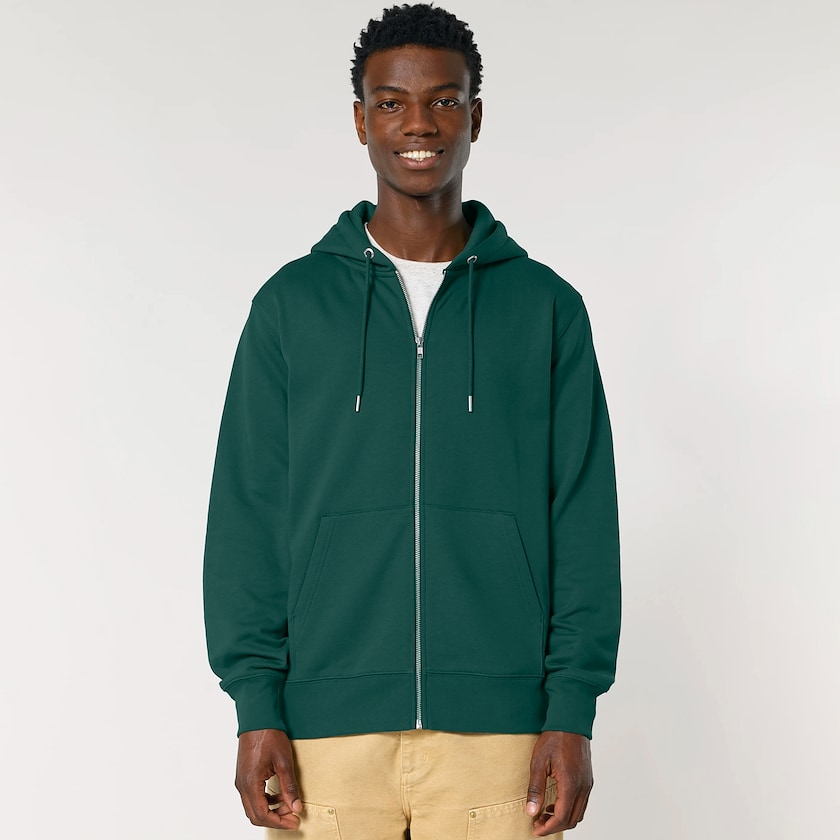 Miljövänlig huvtröja för herrar och damer med lång dragkedja. Huvtröjan är tillverkad av 100% ekologisk bomull.