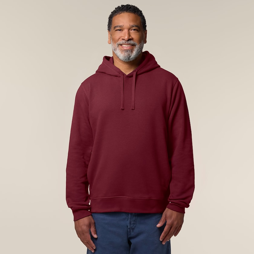 Hoodie av tålig bomull- och polyestermix. Tyget väger 280 g per m² och är tillverkat av 85% ekologisk bomull och 15% återvunnen polyester.