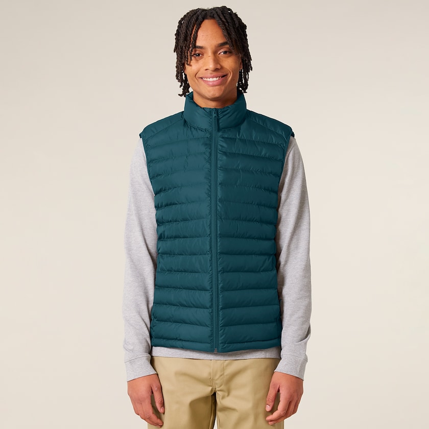 Väst av återvunnen polyester. Västen har hög krage och dragkedjeförsedda sidofickor. Brodyrpriset avser en liten bröstbrodyr. Finns även som dammodell.