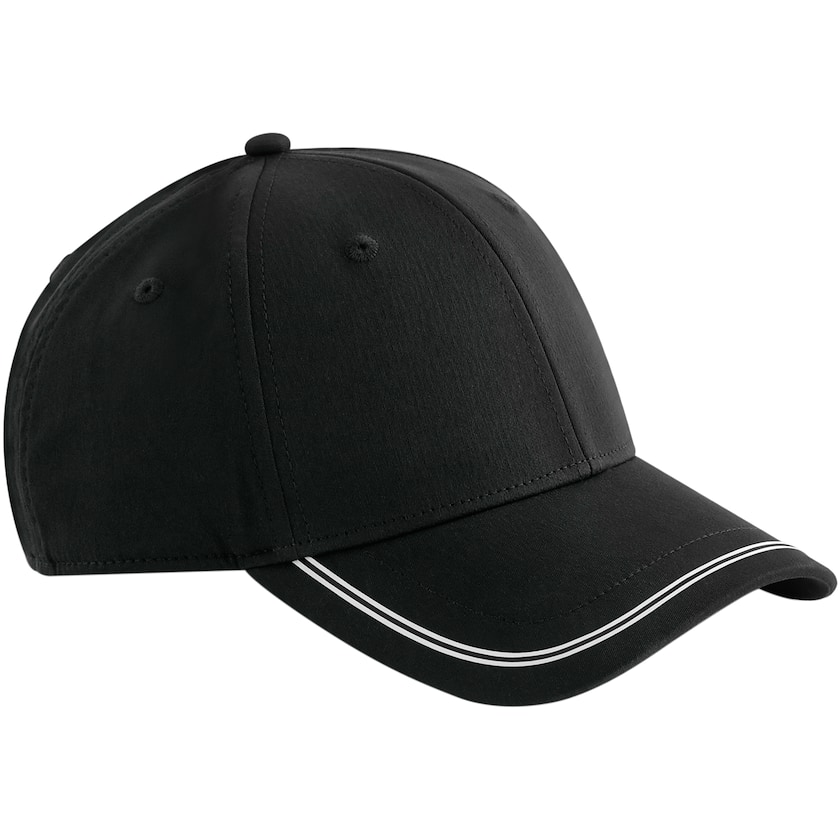 Keps med ränder som löper längs skärmen. Kepsen är tillverkad av 100% GRS-certifierad återvunnen polyester. Framsidan är strukturerad och kepsen böjd.