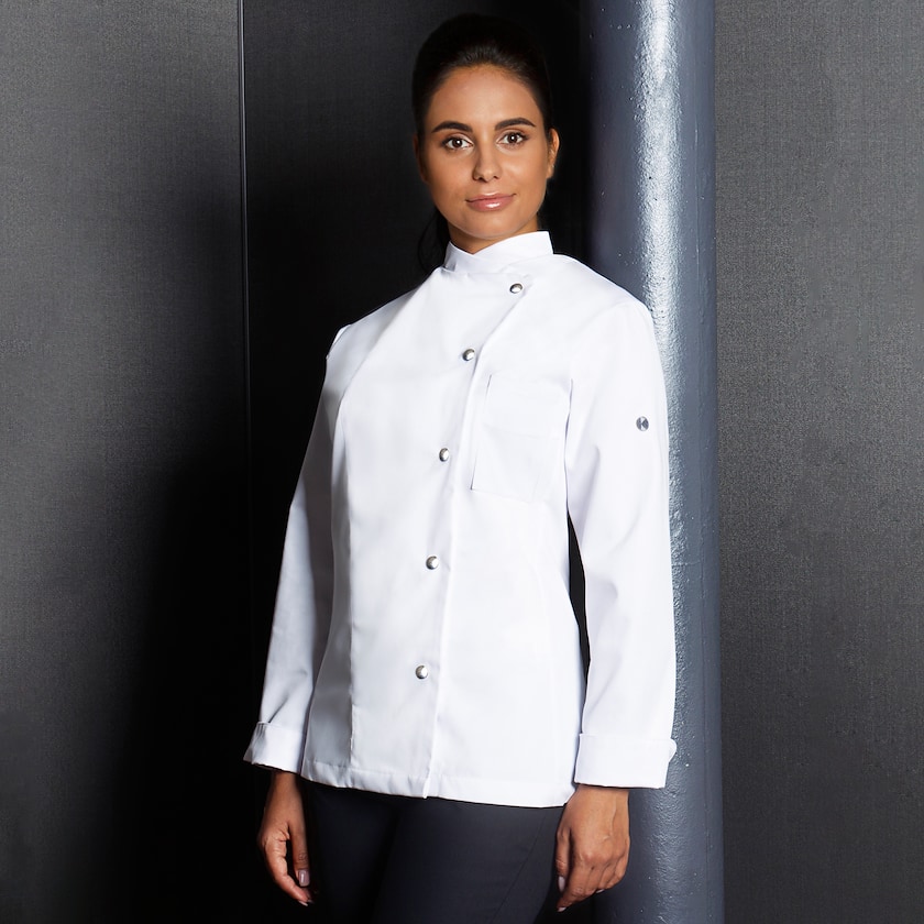 Högkvalitativ kockjacka för damer med easy care-tyg. Jackan har en kroppsnära passform och hålls stängs med 5 tryckknappar. Klarar industritvätt i upp till 95 grader. Kockjackan finns även som herrmodell.