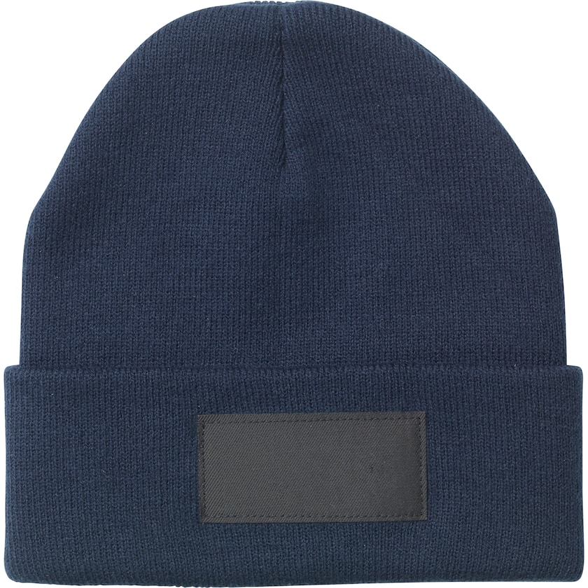 Stickad mössa med tryck av återvunnet material. tyget är tillverkat av rPET, dvs återvunna PET-flaskor. Framtill finns en påsydd etikett där trycket görs. Endast 1-färgstryck är möjligt.