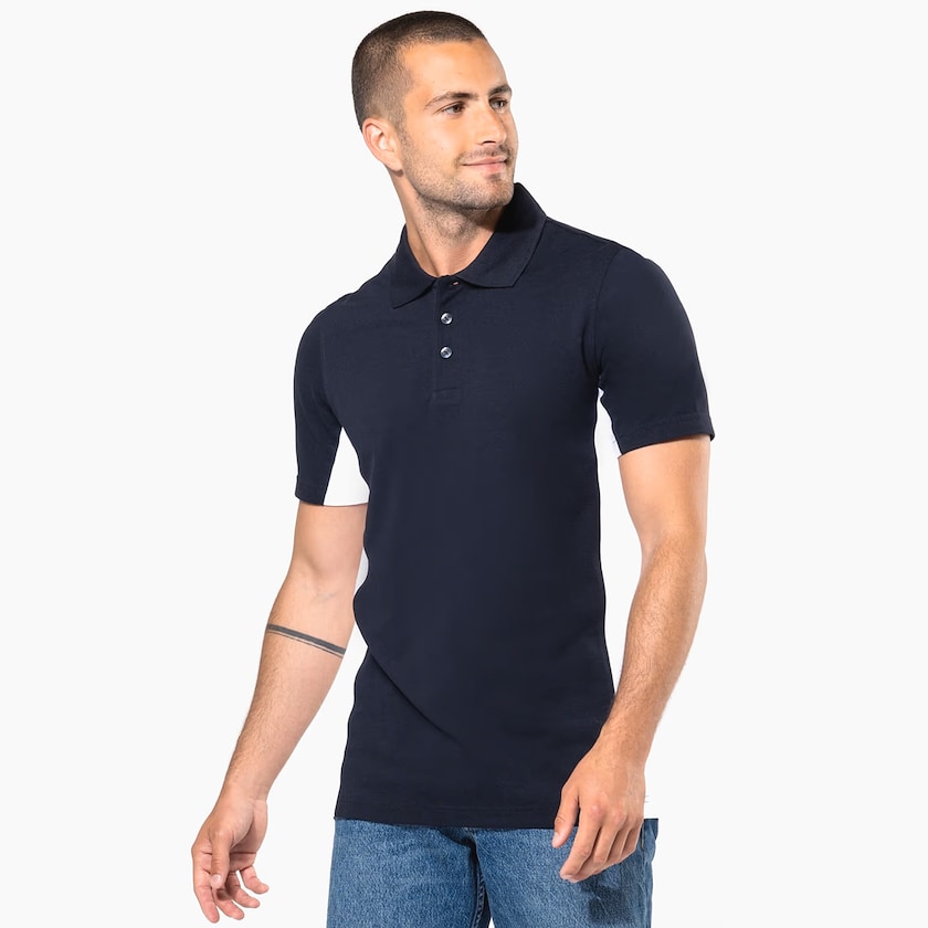 Sportig pikétröja med kontrastfärg på ärmar och kroppssidor. Tröjorna levereras styckförpackade i plastpåse.