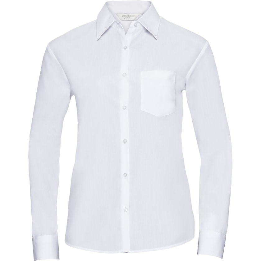 Långärmad damskjorta i tålig polyesterblandning för hårt användande. Levereras styckförpackad i plastpåse.