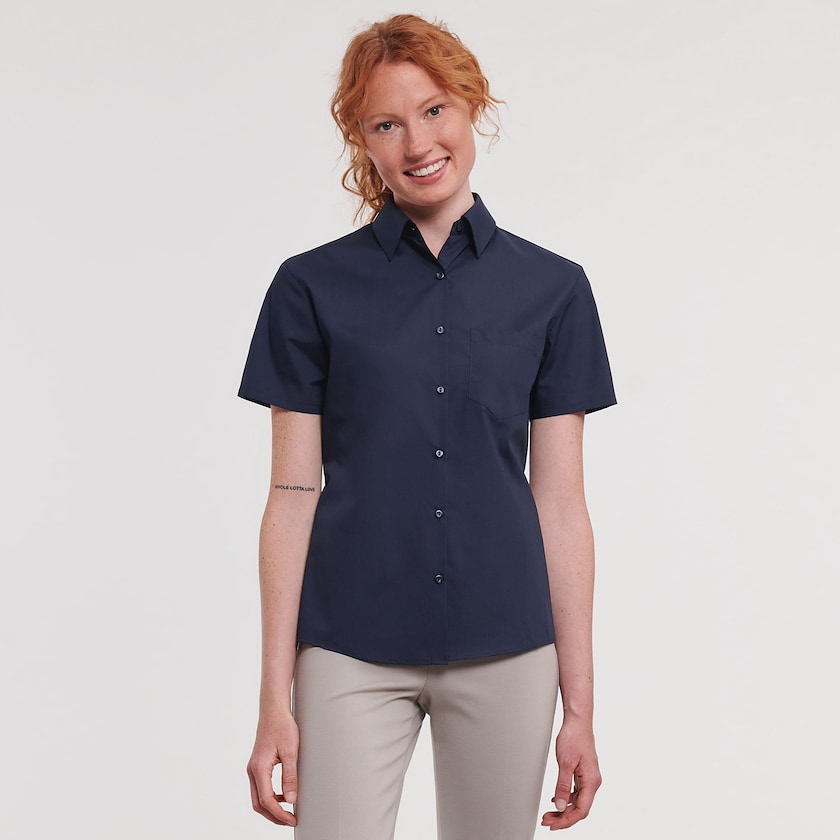 Kortärmad damskjorta i tåligt tyg av polyesterblandning. Levereras styckförpackad i plastpåse.