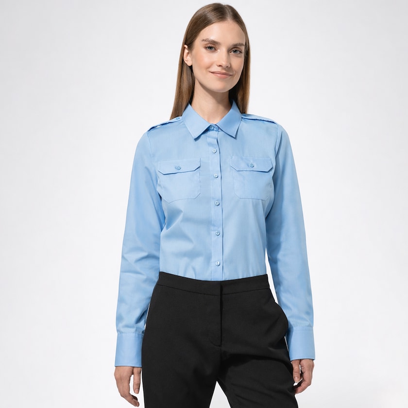 Långärmad pilotskjorta för damer. Skjortan är utrustad med dubbla bröstfickor och fästen för axelklaffar. Levereras individuellt förpackad i plastpåse. Finns även som herrmodell.
