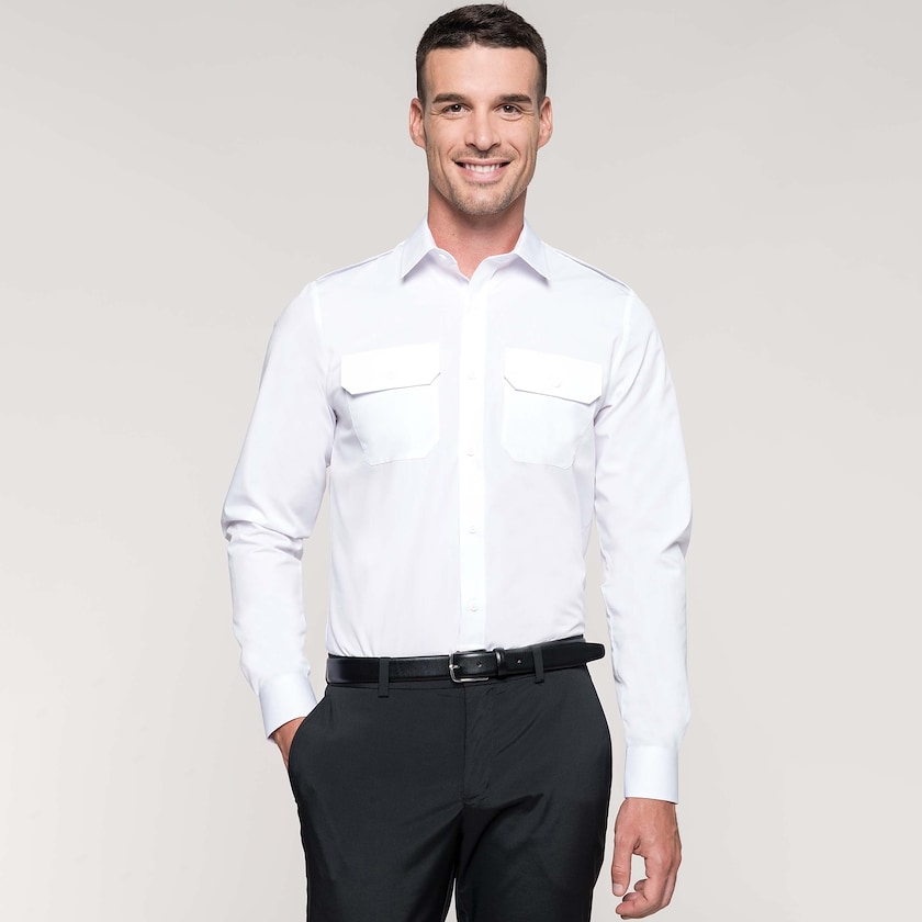 Långärmad pilotskjorta för herrar. Skjortan har dubbla bröstfickor och fästen för axelklaffar. Levereras styckförpackad i plastpåse. Finns även som dammodell.