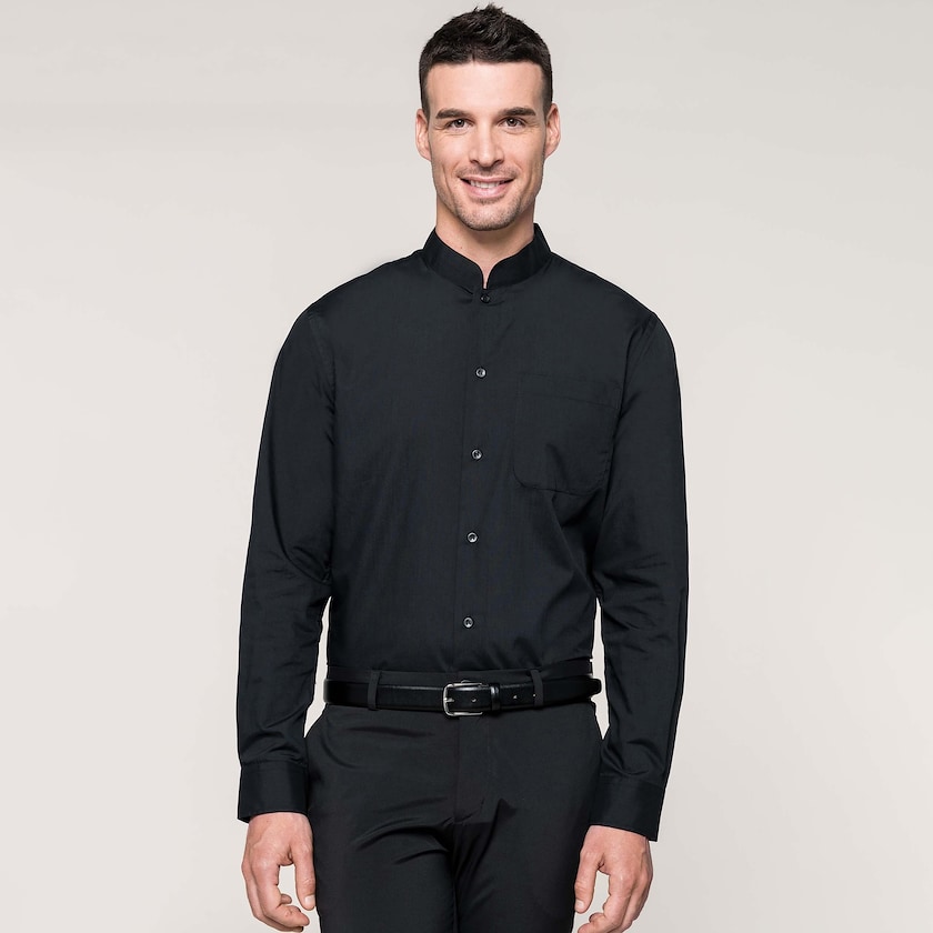 Herrskjorta med mandarinkrage. Skjortan är tillverkad av ett tåligt och lättskött tyg av typen easy-care. Levereras styckförpackad i plastpåse. Finns även som dammodell.