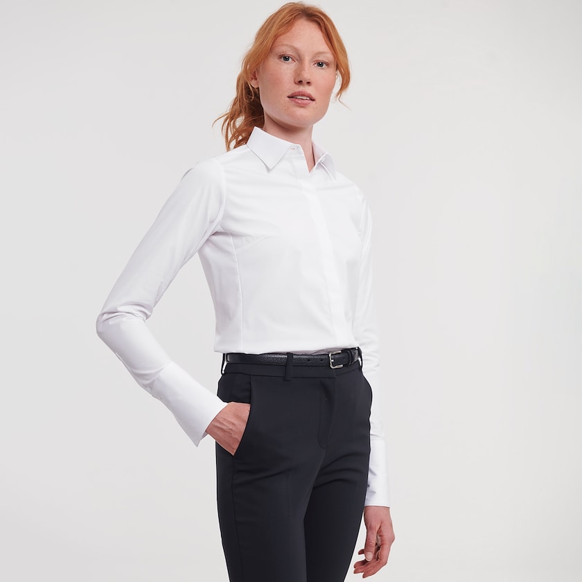 Högkvalitativ damskjorta med unikt tyg med stretch. Skjortans tyg innehåller det revolutionerande materialet LYCRA T400 som ger en mjuk stretch åt tyget. Tyget är dessutom av typen easy care och blir ytterst sällan skrynkligt. Levereras styckförpackad i plastpåse. Finns även som herrmodell.