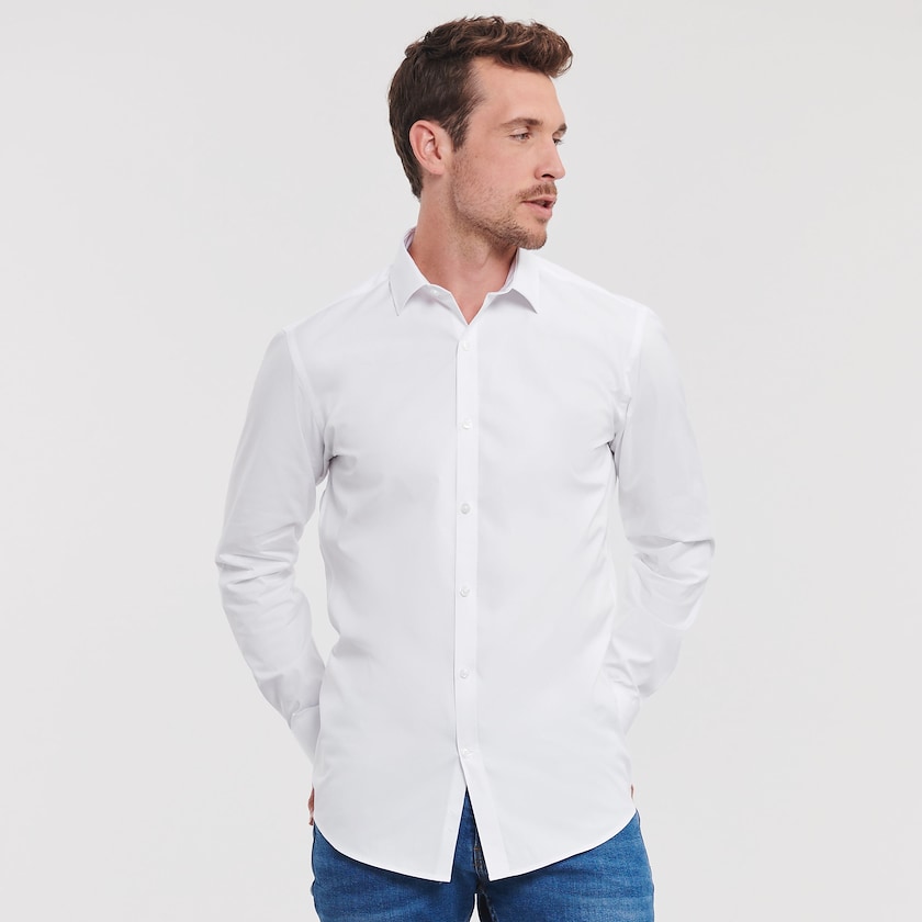 Högkvalitativ herrskjorta med unikt tyg med stretch. Skjortans tyg innehåller det revolutionerande materialet LYCRA T400 som ger en mjuk stretch åt tyget. Tyget är dessutom av typen easy care och blir ytterst sällan skrynkligt. Levereras styckförpackad i plastpåse. Finns även som dammodell.
