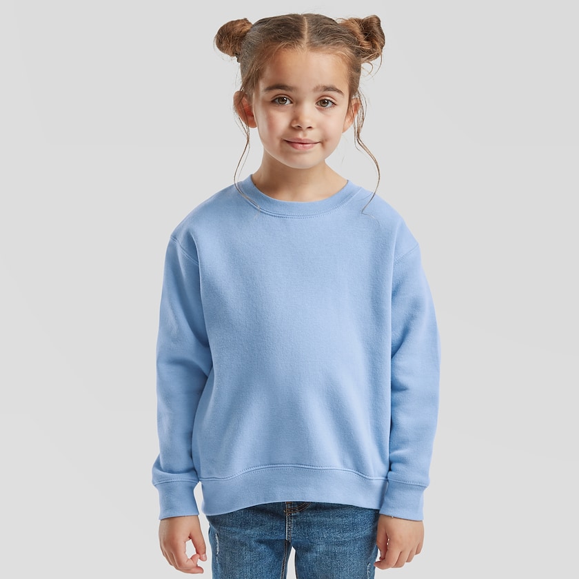 Slitstark barnsweatshirt från Fruit of the Loom. En tålig lekkamrat! FOTL Kids Premium Set-in Sweat har en något högre polyesterblandning än vanliga FOTL Kids Classic Set-in Sweat. Den är därmed mer tålig och klarar fler tvättar än normalt. Levereras styckförpackade i plastpåse. Finns även som vuxenmodell.