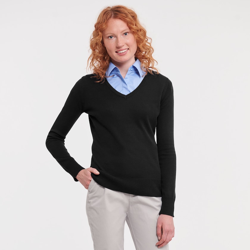 Elegant stickad tröja i dammodell. Tröjan är v-ringad och tillverkad av Easy Care bomullsblandning. Denna kombinerar bomullens lätthet med akrylens mjukhet. Tröjan tål torktumling och tvättas i 40 grader. En elegant tröja för dig som söker ett mer välklätt alternativ. Levereras styckförpackade i plastpåse. Finns även som herrmodell.