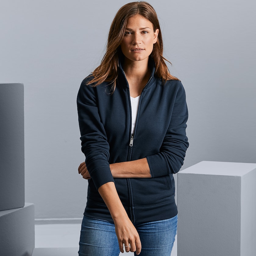 Tröja med lång dragkedja och rak skurning. På sidorna finns fickor. Märkning kan antingen ske med tryck eller brodyr på bröstet eller med tryck på ryggen. Finns även som herrmodell.