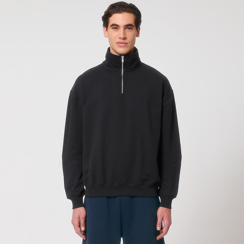 Sweatshirt med hög krage och dragkedja i halsen. Sweatshirten är av typen set-in-sleeve och är tillverkad av ekologisk bomull. Finns i flera spännande färger.
