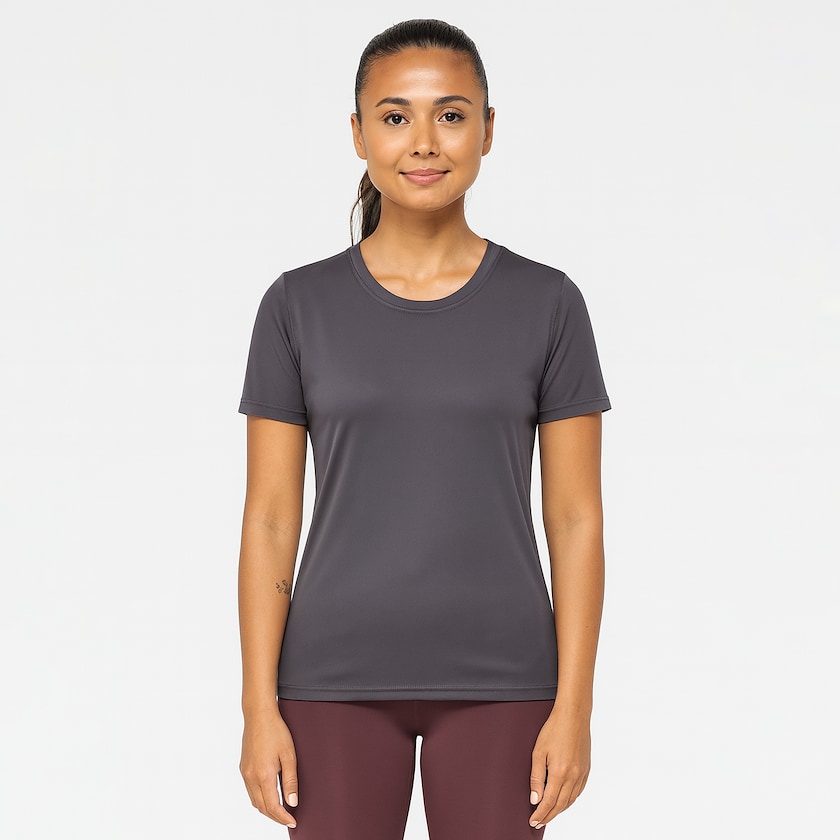 Tränings-t-shirt för damer med svalt tyg av polyester. T-shirten har rund hals och figursydd passform. Tyget håller dig sval även vid intensiv träning. Finns även som herrmodell.