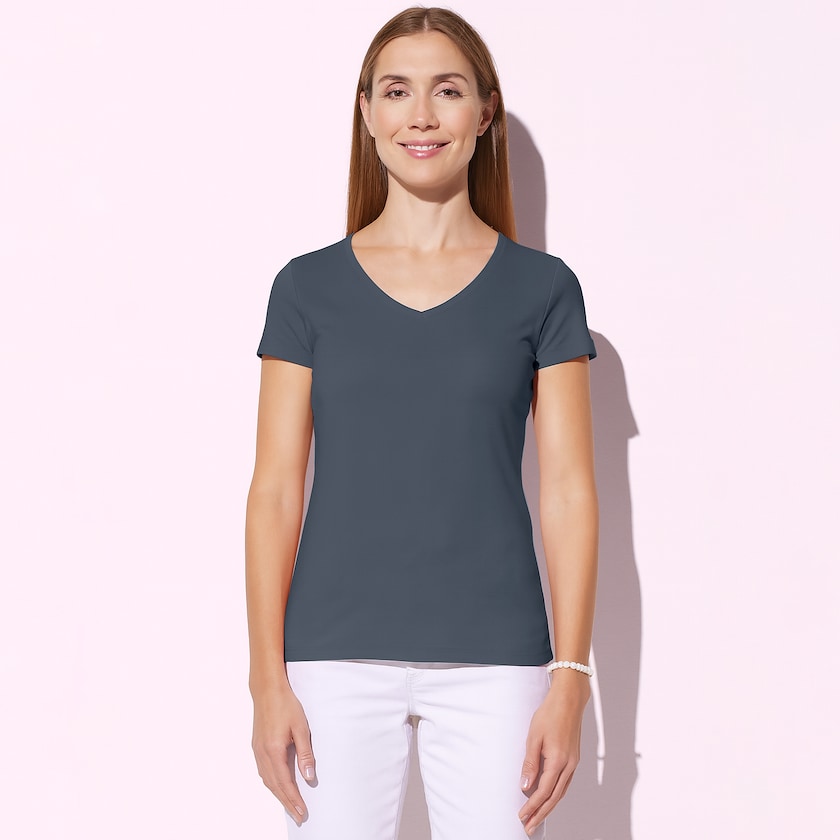 Figursydd dam-t-shirt med V-ringad hals och lite extra längd. Tröjorna levereras styckförpackade i plastpåse.
