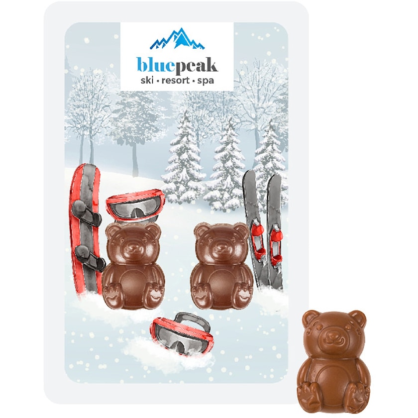 Två gulliga björnar av mjölkchoklad på ett blisterkort. Kortet trycks med digitaltryck helt efter dina önskemål. Alla barns favorit!