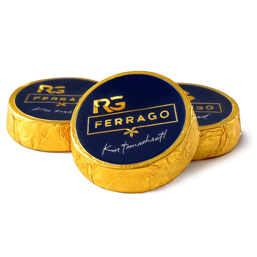 Rund chokladbit med guldfolie. Trycket sker på en etikett som placeras på ovansidan. Chokladbiten har 50% kakaohalt och håller hög kvalitet.