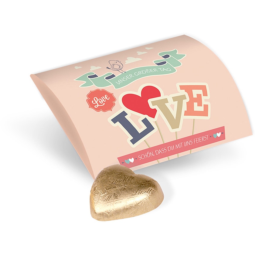 Lindt chokladhjärta i pappförpackning med eget tryck. Förpackningens in- och utsida trycks efter önskemål. Välj mellan guldfärgad eller rött folie.