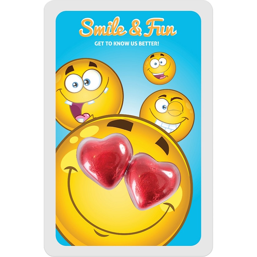 Digitaltryckt kort med två chokladhjärtan bakom blister. Chokladhjärtana är gjorda av utsökt mjölkchoklad och väger totalt 10 gram. Välj mellan röd, silverfärgad eller guldfärgad folie.