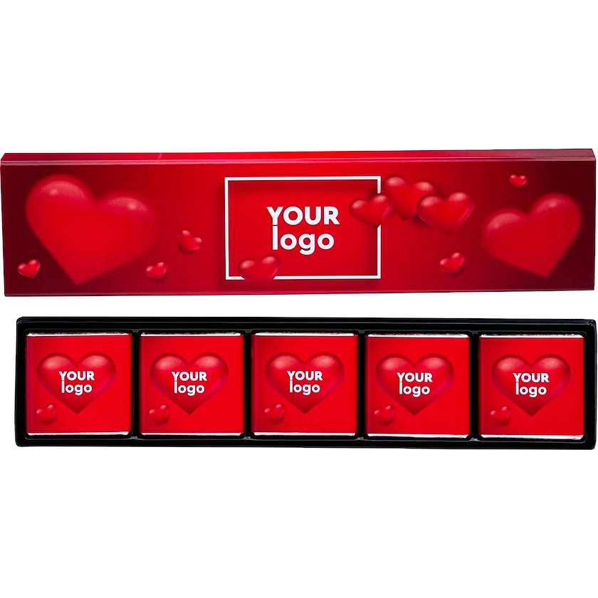 Chokladask med 5 st chokladkvadrater. Chokladasken samt chokladkvadraterna trycks efter dina önskemål. Välj mellan mjölkchoklad eller mörk choklad.