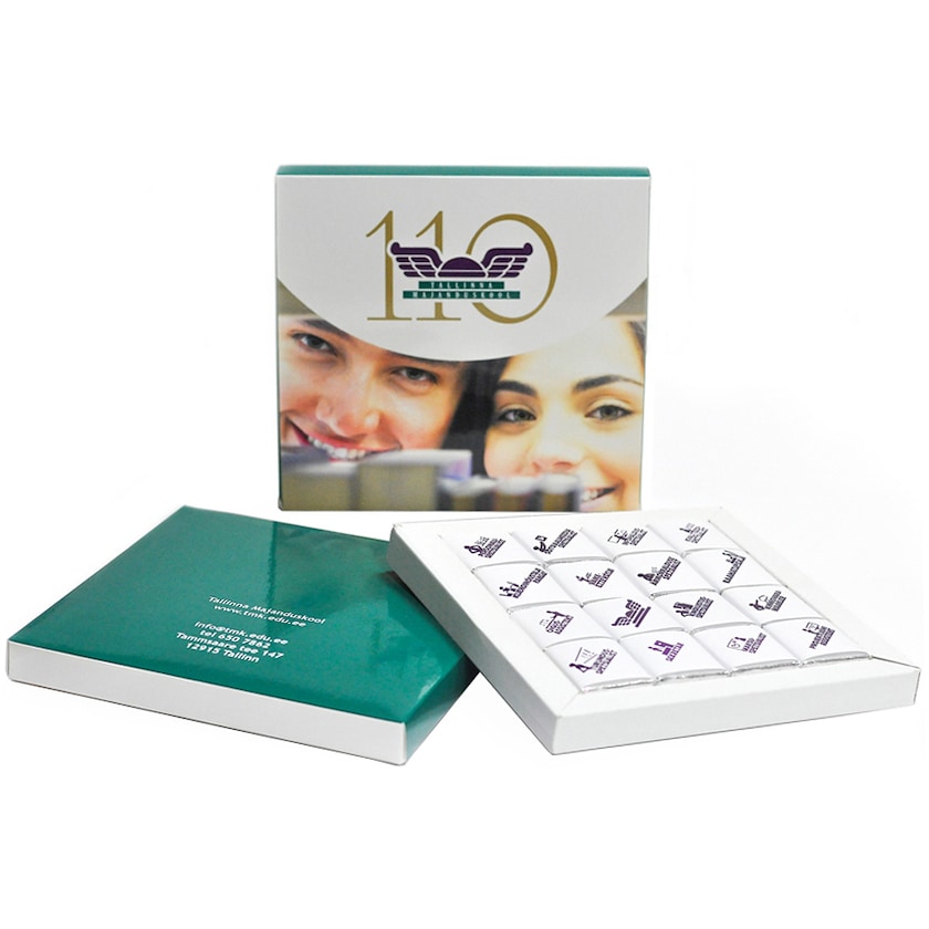 Chokladask med 16 chokladkvadrater. Hela kartongen samt alla chokladkvadrater trycks efter dina önskemål. Du väljer mellan tre härliga chokladsmaker. En perfekt gåva till viktigare kunder.