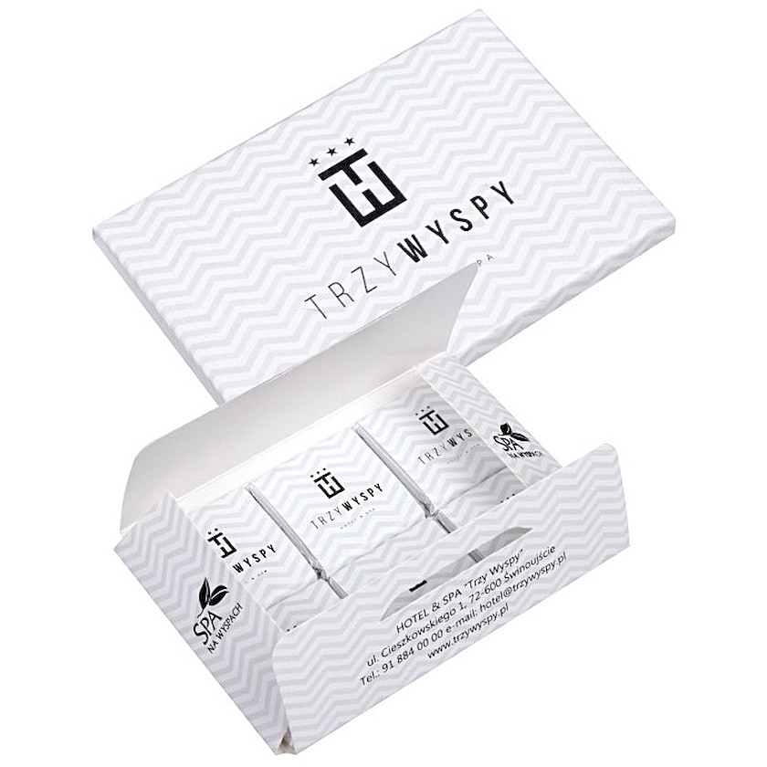 Chokladask med 6 st 5 grams chokladkvadrater. Chokladen kan fås med folie i silver, guld, blå, röd eller svart färg. Asken liksom chokladpappret trycks med digitaltryck efter önskemål.