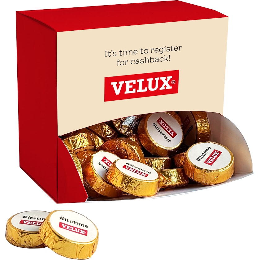 Liten pappbox fylld med runda chokladbitar i guldfolie. Chokladbitarna har 50% kakaohalt och smakar utsökt. Tryckpriserna avser tryck på hela papplådans utsida samt tryck på chokladbitarnas etikett.