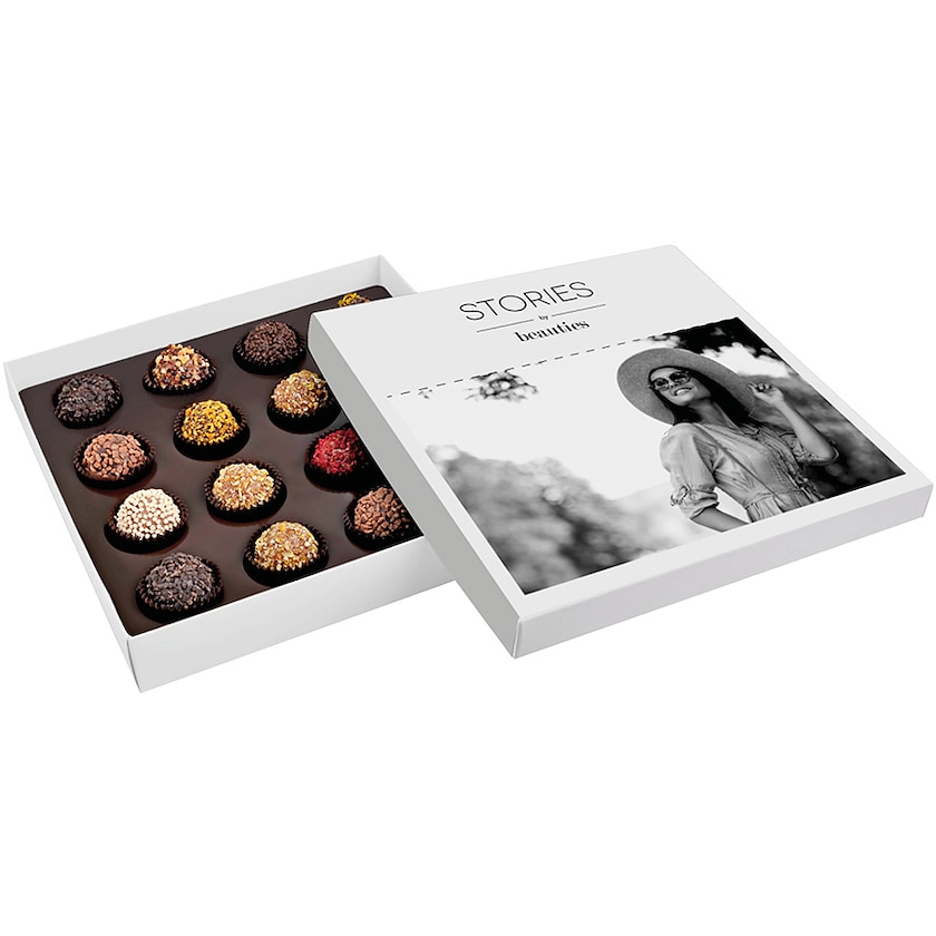 Stor chokladask med 16 st chokladpraliner. Chokladpralinerna håller absolut högsta kvalitet och kommer i blandade smaker. Chokladasken digitaltrycks helt efter önskemål. En perfekt gåva till viktiga kunder!