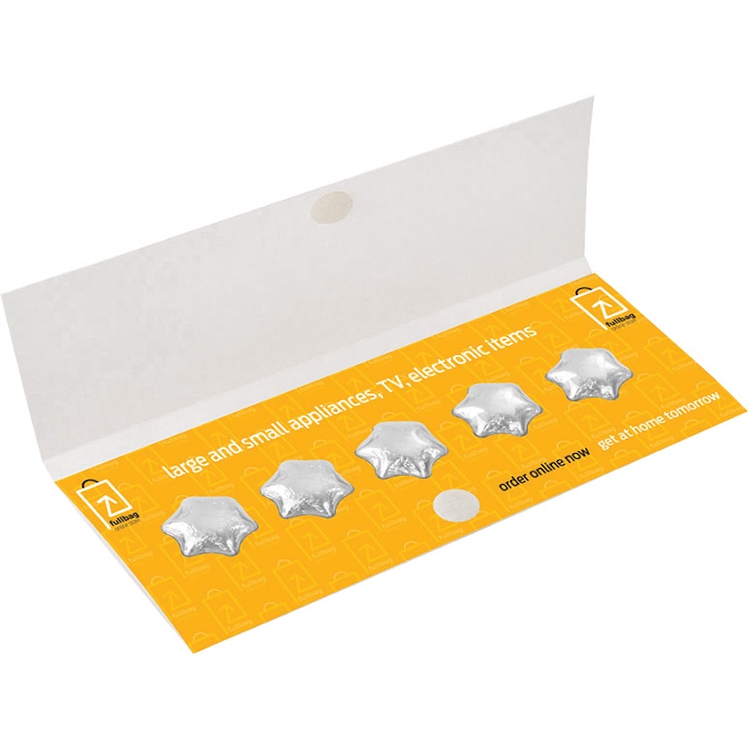 Chokladask med fem chokladstjärnor av högkvalitativ mjölkchoklad. Hela kartongen trycks efter dina önskemål och du kan välja mellan röd, silverfärgad eller guldfärgad folie.