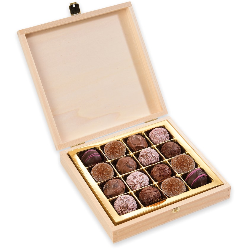 16 st chokladpraliner av finaste belgisk choklad i träask. Chokladpralinerna kommer i blandade smaker och görs efter beställning så att de levereras helt färska. Trycket sker på träaskens lock.