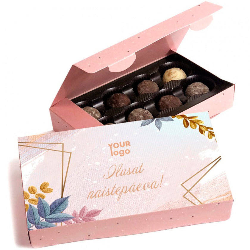Chokladask med åtta chokladtryfflar. Chokladtryfflarna kommer i blandade smaker. Hela asken trycks efter dina önskemål. En lyxig gåva till viktigare kunder och medarbetare.