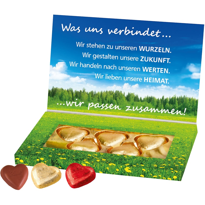En liten ask med omtanke! Presentask med 5 st chokladhjärtan från Lindt. Asken digitaltrycks helt efter dina önskemål och försluts individuellt med genomskinlig plastfolie.