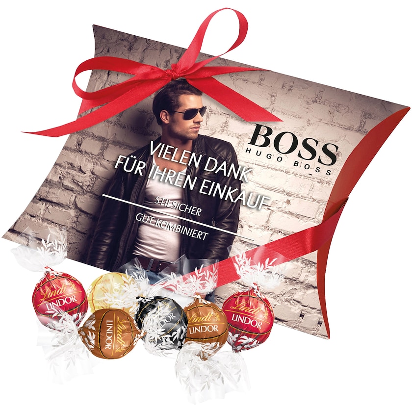 Stor presentkartong med eget tryck fylld med 15 st Lindor-praliner. Pralinerna kommer blandat i smaker mjölkchoklad, vit choklad, hasselnöt och mörk choklad. Ladda ner tryckmallen och skapa en helt unik chokladkartong! Kartongen dekoreras med ett vackert band i antingen silver, rött, blått eller grönt.