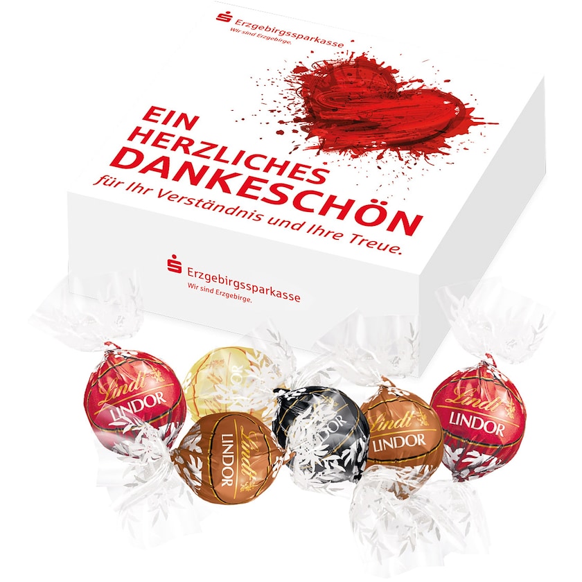Presentkartong med eget tryck fylld med 6 st Lindor-praliner. Pralinerna kommer blandat i smakerna mjölkchoklad, vit choklad, hasselnöt och mörk choklad. En lyxig chokladkartong med underbart välsmakande innehåll!