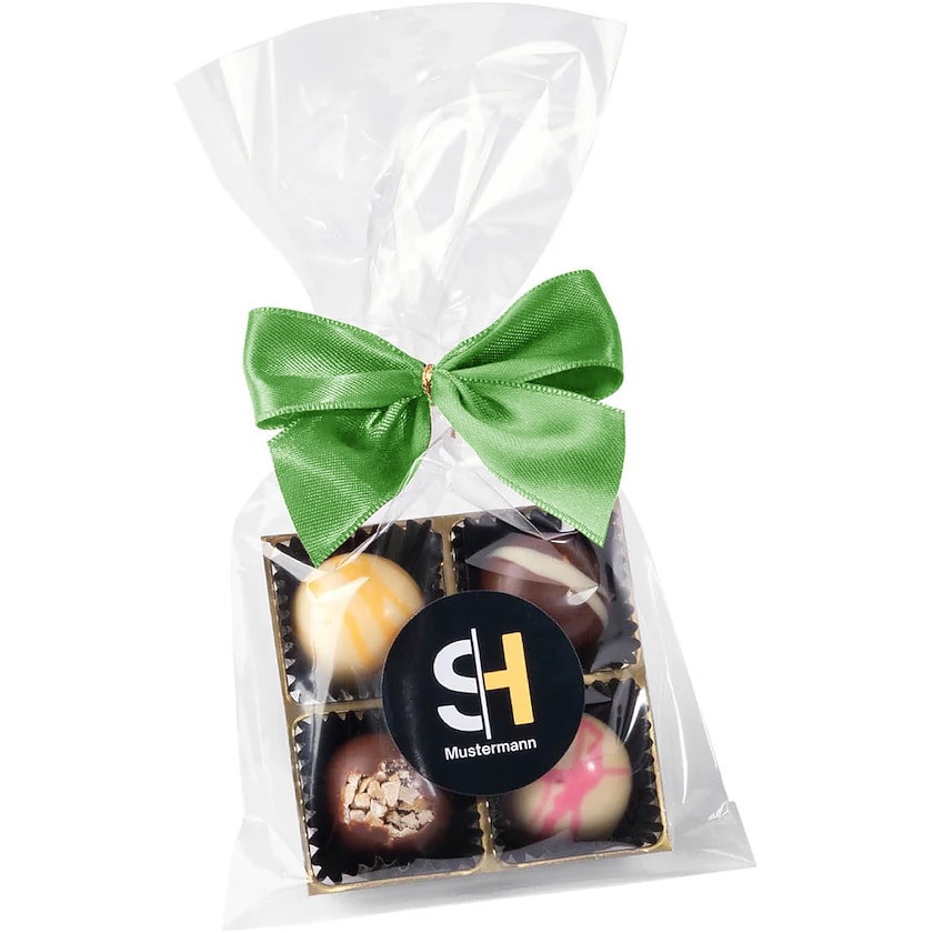 Exklusivt set med fyra utsökta chokladpraliner i olika smaker. Chokladpralinerna kommer i smakerna choklad med passionsfrukt, hallon, nougat samt crème brûlée. Levereras i en elegant förpackning med en digitaltryckt klisterdekal samt rosett.