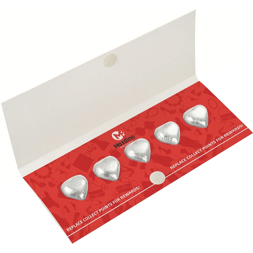Chokladask med fem chokladhjärtan av mjölkchoklad. Hela chokladasken trycks efter dina önskemål. Välj mellan silverfärgad, guldfärgad och röd foliefärg.