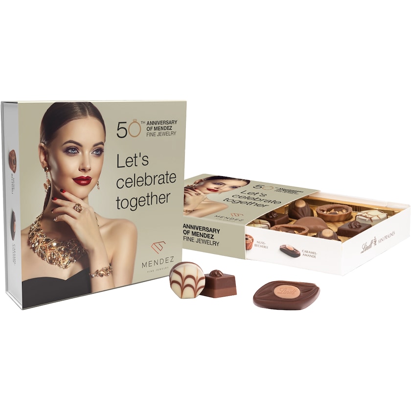Nio exklusiva praliner från chokladtillverkaren Lindt i en presentkartong. Kartongen har ett transparent lock med en inlaga som trycks efter önskemål.