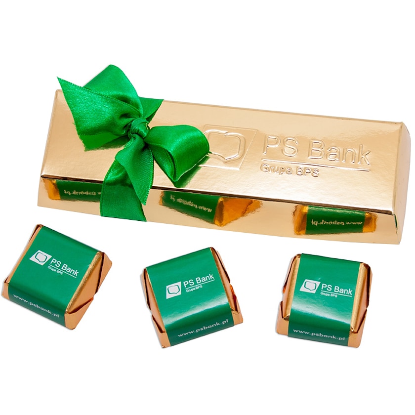 Guldfärgad chokladask som innehåller fyra chokladpraliner. Chokladasken präglas med din logotyp och chokladpralinerna trycks med digitaltryck. Båda märkningarna är inkluderat i tryckpriset. Chokladpralinerna kan fås i smakerna pistage, choklad eller en mix av de båda smakerna. Chokladasken är försedd med en rosett som kan fås i någon av färgerna rött, blått, grönt, rosa, vitt eller svart.