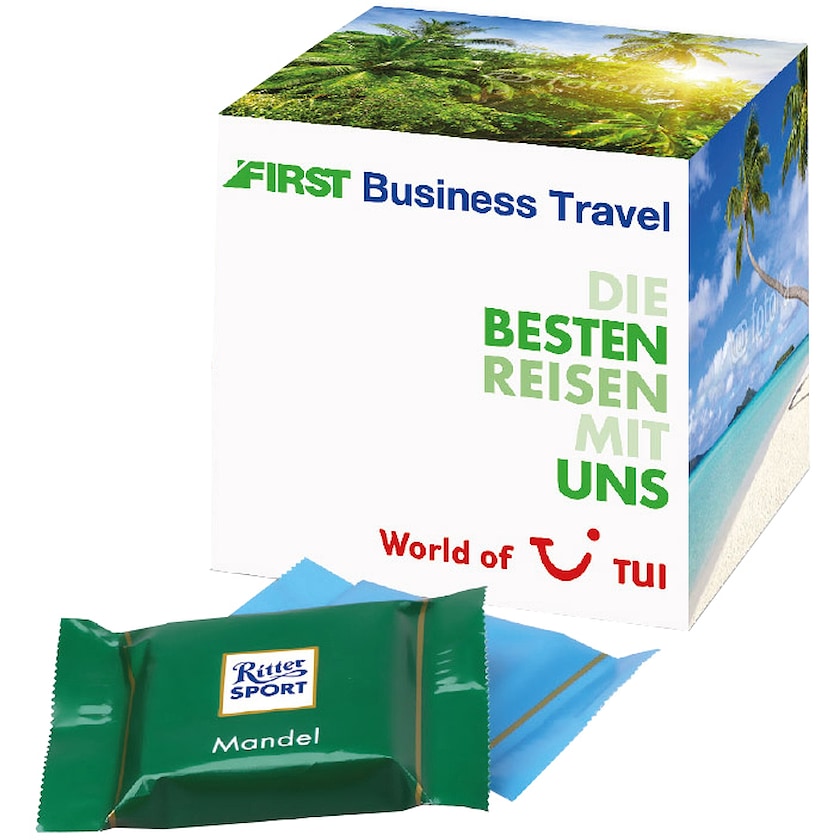 Liten papplåda med 5 st Ritter Sport Quadretties. Alla papplådans sidor designas helt efter dina önskemål. Chokladbitarna kommer i blandade smaker (Alpenmilch, Halbbitter, Knusperflakes och Mandel).